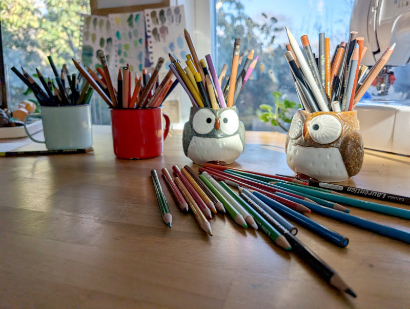 I hand draw and color everything. I guess I just never got on board with all the digital art . . . probably because I hate sitting at the computer! I'd much rather be hands-on, feeling the real materials on the page and watching how the art unfolds. With no "undo", sometimes pieces take an unexpected turn! I love this and work with it as best I can. It's a great antidote to trying to be "perfect".