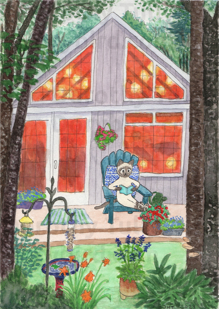 Need some quiet reading time? Join this cat at a cozy cottage in the woods! It's a cloudy afternoon at the end of summer, but there's time for (at least) one more chapter. I was super inspired this summer by the cute cottages peppered around the countryside in Nova Scotia! I'll be making more paintings in this series. ;)