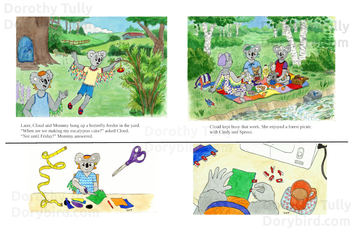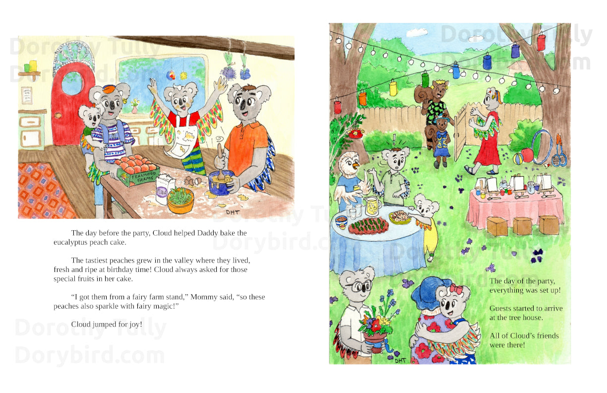 Koalabirds are koalas who can fly! They live in a magical land of great green forests, fairies, and all sorts of animals. In this story, six-year-old koalabird Cloud wishes for a rainbow butterfly to join her at her birthday party!